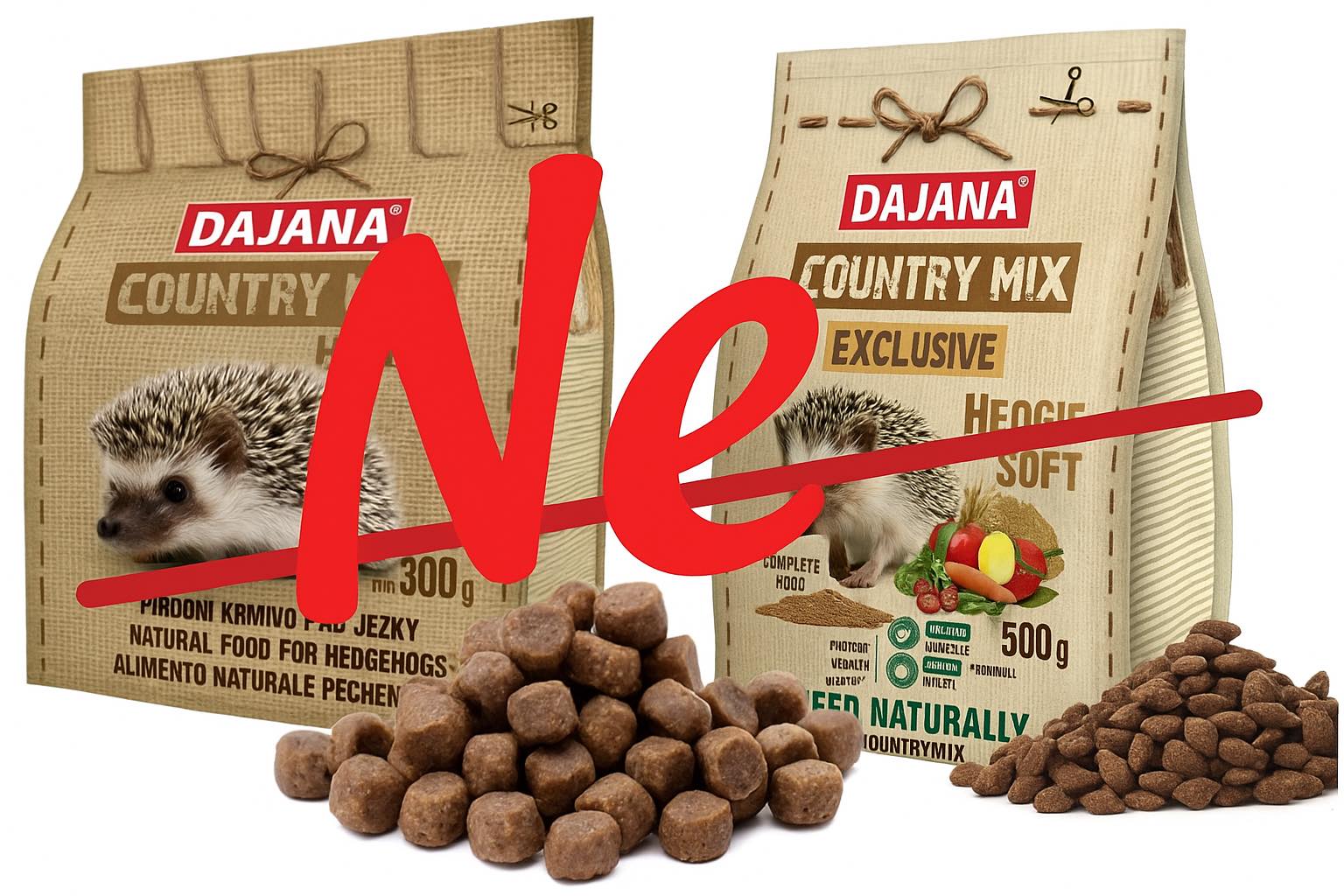 Pozor! na marketingový tahák, kterým jsou jakékoliv výrobky označené jako 'pro ježky'. Na českém trhu momentálně nejsou dostupné žádné výrobky, které by mohly být označovány za 'vhodné pro ježky', které by jim neublížily. Obsahují spoustu obilovin, rybí bílkoviny, tuk, sůl, ovoce, koření atd. Hezký ježeček na obalu je silným tahákem, protože když na to šoupli ježka, tak je to asi dobré, ne? Ne :)